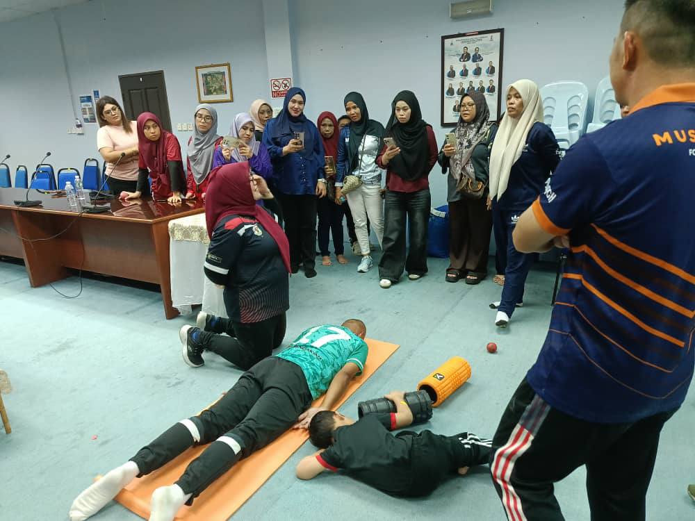 Sesi yang berlangsung di Bilik Mesyuarat, Kompleks Sukan Sandakan telah dikendalikan oleh Zuliana Bacho, Pensyarah Sains Sukan dan Pemulihan Fizikal UMS, yang berkongsi ilmu, demonstrasi praktikal serta panduan keselamatan dalam pelaksanaan teknik SMR.